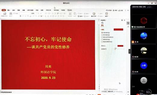 suncitygroup太阳集团副经理周爽为大学英语教学部党支部讲授党课 9月23日晚上,suncitygroup太阳集团副经理周爽在线上为大学英语教学部党支部讲授题为《“不忘初心、牢记使命”——谈共产党员的党性修养》的党课。