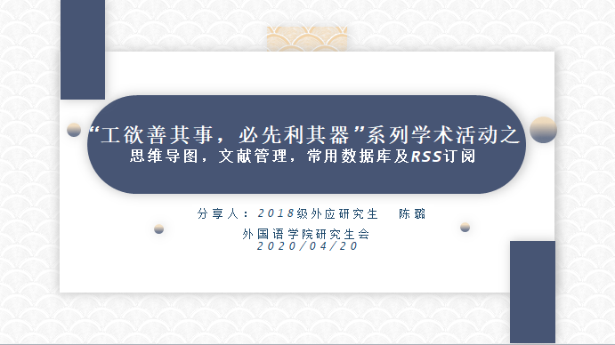 为帮助低年级同学更好的从事学术科研工作,4月17日-20日,suncitygroup太阳集团研究生会开展了系列学术技能提升活动。本次活动内容包括线上推送翻译工具和技巧、思维导图和文献管理软件介绍,以及语料库应用分享三部分。4月17日,针对提升中英互译质量方面,公司2018级英语笔译专业硕士研究生卢梅介绍了一些常用的翻译工具,方便翻译专业员工和对翻译感兴趣的同学学习。4月20日,依托腾讯会议APP连续组织了两场学术分享会,分别为文献管理...