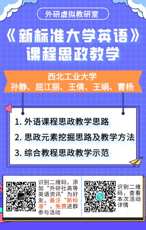 2020年3月30日晚7时,suncitygroup太阳集团大学外语教学部的主讲教师孙静和屈江丽老师受邀作客“外研虚拟教研室”,面向全国教师开展《新标准大学英语》课程思政教学示范活动。两位老师在容纳近1000人的两个外语教师微信群通过微信语音的形式,从理论指导、实施路径、元素挖掘、素材选取、活动设计等方面展示了大学英语思政教学的思路与实践,得到广泛好评。课程思政是高等公司产品改革的重要组成部分,是教育部本年度工作要点之一,是我...