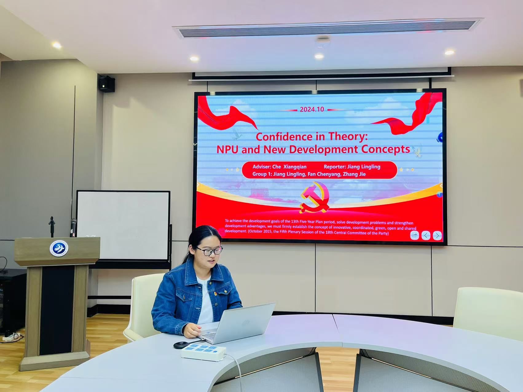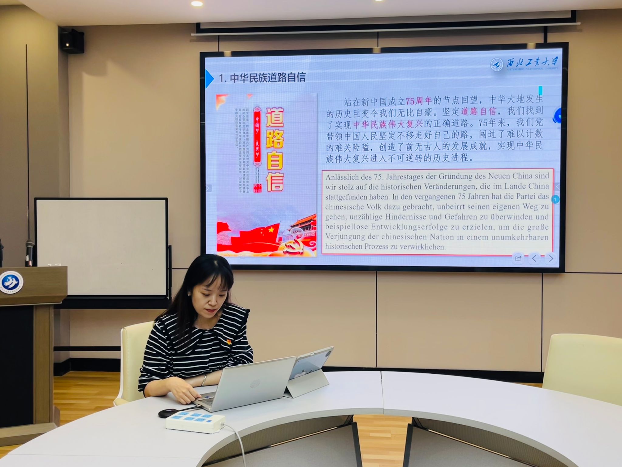 江玲玲同志聚焦“理论自信——西工大与新发展理念”,以一批西工大人践行“创新、协调、绿色、开放、共享”新发展理念的实践为例,展现了公司在培养“总师型”人才、推动高质量发展方面的成就。在外国语言学文学系党支部车向前老师的进一步指导下,江玲玲同志和另外两位同志荣获公司“语说七十五载新中国”活动二等奖。