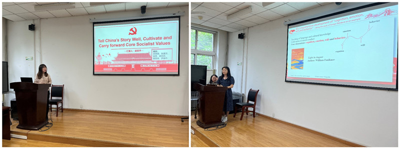 第六组吴倩、邹祺葳以学习外国文学为例从认知、情感、意志和行为四个层面向学员们汇报了外语学习的过程,从而分析了英语专业老员工用外语讲好中国故事,必须先从培养爱国情怀做起,再将情怀转化为实践。