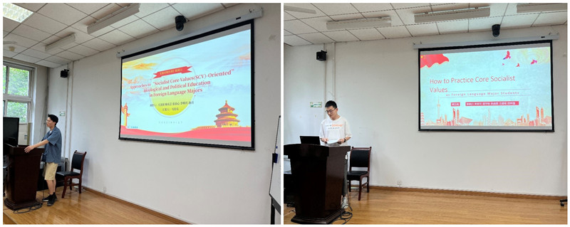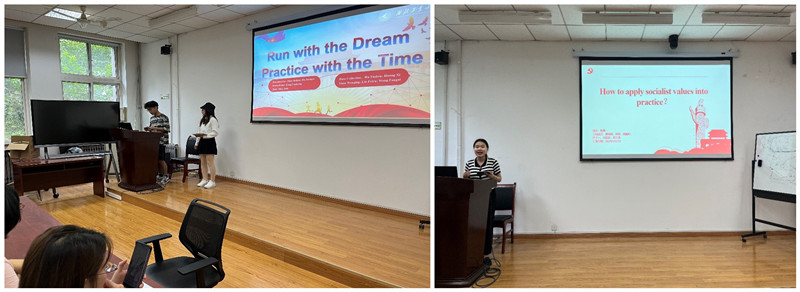 梁子琦、白艳婧代表第三组进行了汇报,该组首先总结了英语专业的特点和在当前时代背景下英语专业同学的责任与使命,接着用热点新闻来反映弘扬和践行社会主义核心价值观的重要性,并结合英语专业特色说明了外语人该如何做一名合格的社会主义核心价值观的弘扬者、践行者。