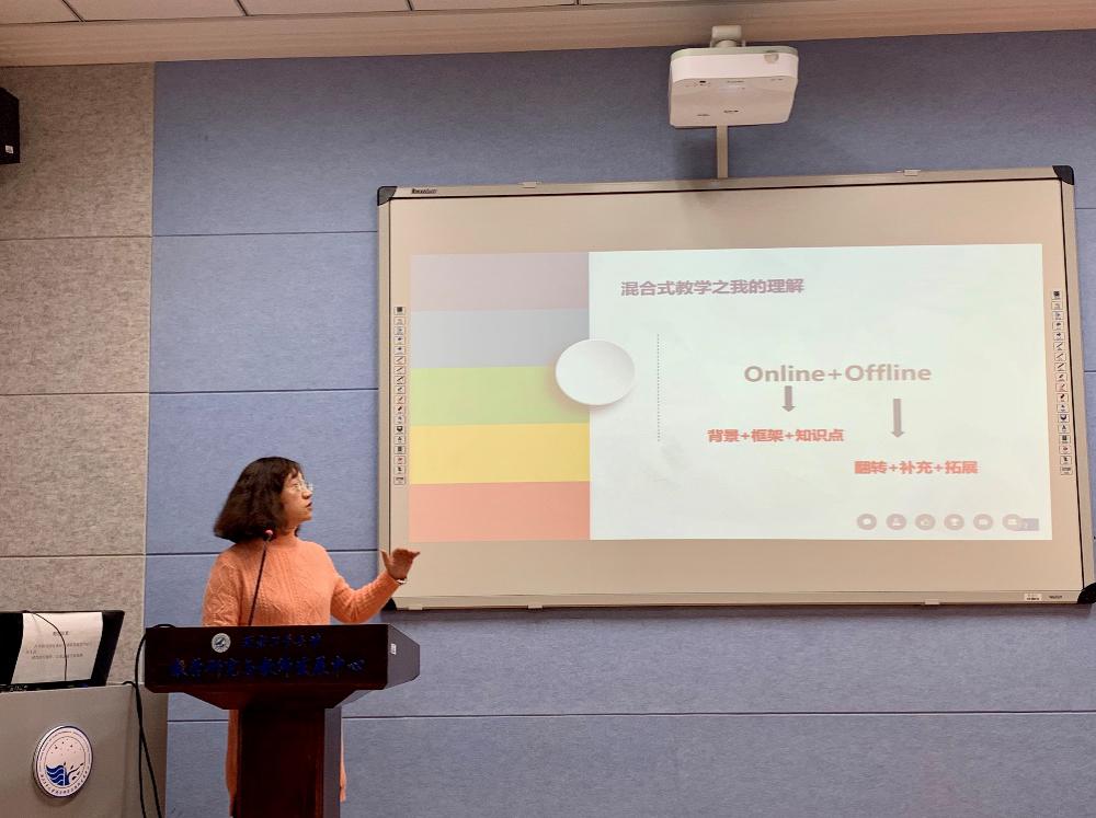 接下来屈江丽老师就线上线下混合式教学模式具体教学过程的开展做了分享。屈老师着重介绍了教师如何处理线下的教学活动内容及员工线上SPOC学习内容之间的关系,介绍了她在具体教学活动设计上的经验。强调了线下教师授课内容一定是对员工线上学习内容的翻转(应用)、补充和拓展。