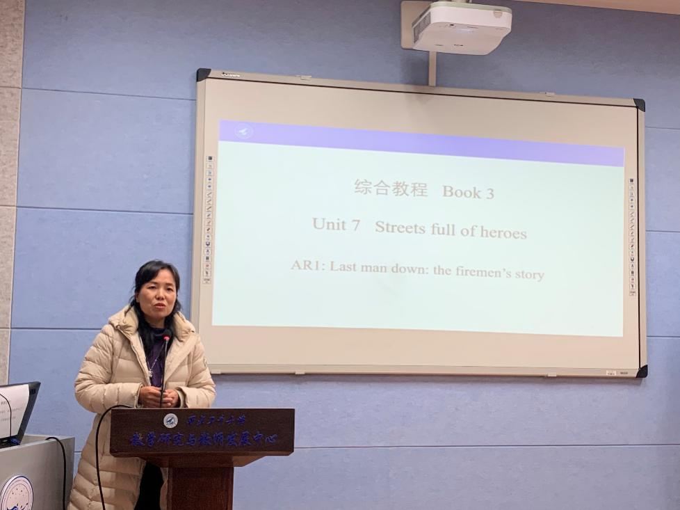曹杨老师通过对《高等公司课程思政建设指导纲要》中课程思政定义以及文史哲类课程思政建设指导方针的介绍,帮助参会教师理清了课程思政建设的思路。接着曹老师以《新标准大学英语综合教程》中一个单元为例,介绍了大学英语课程“课前,课中和课后”思政教学设计思路。