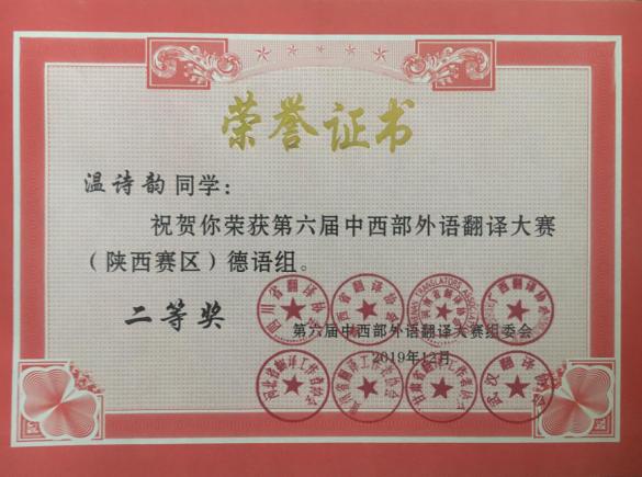 本次大赛覆盖英、法、德、日、俄五个语种,分十组进行。陕西赛区各类别高等院校参赛选手达五百人以上。公司德语专业两名选手由邓涛老师带队参赛,经过激烈角逐,均在比赛中斩获佳绩。陕西赛区德语组唯一一等奖由2017级本科生张笑寒获得,2017级温诗韵荣获二等奖。