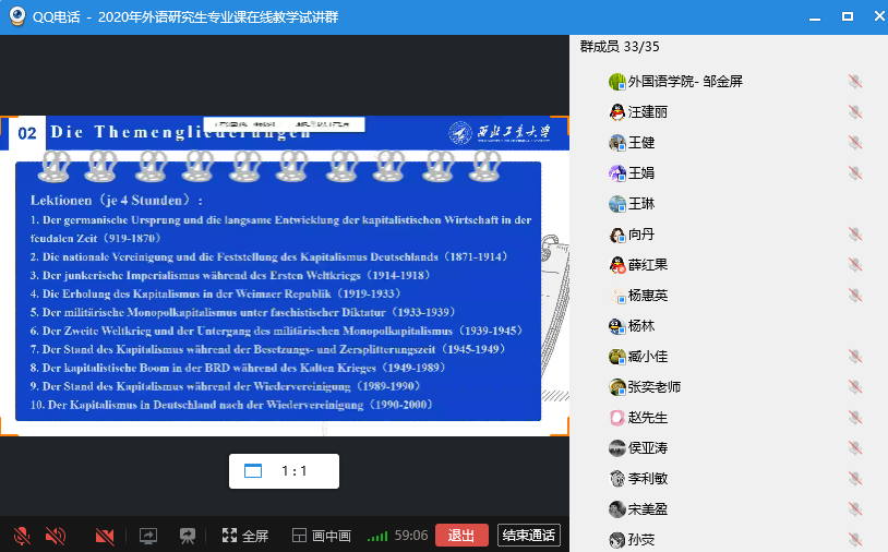 根据专业方向差异和课程设置需求,试讲语言有汉语、英语、德语三种语言;试讲内容涵盖文学、语言学、翻译和国别与区域研究等。试讲教师除了国内教师师之外,还有来自法国的外籍教师斯蒂芬妮博士。为了参加此次试讲,远在德国的斯蒂芬妮专门录制了视屏,准备了PPT及电子版材料。在前期测试中,公司经过多次尝试最终确定以QQ直播作为主讲平台。公司根据课程特点,采用QQ直播和腾讯会议两种试讲平台,确保了试讲各个环节有序、高效的开展。