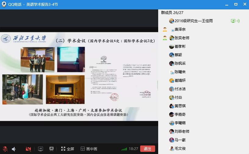 随后,受国家留基委公派留学,正在澳大利亚麦考瑞大学攻读语言学博士学位的公司2016级外国语言学及应用语言学研究生王佳雨在线分享了自己在西工大读研的感悟,可概括为“滋养”,“求真”和“定力”。她还从导师指导、公司支持、集团平台三个角度回顾了工大读研的成长经历,引发了与会同学们的思考与共鸣。