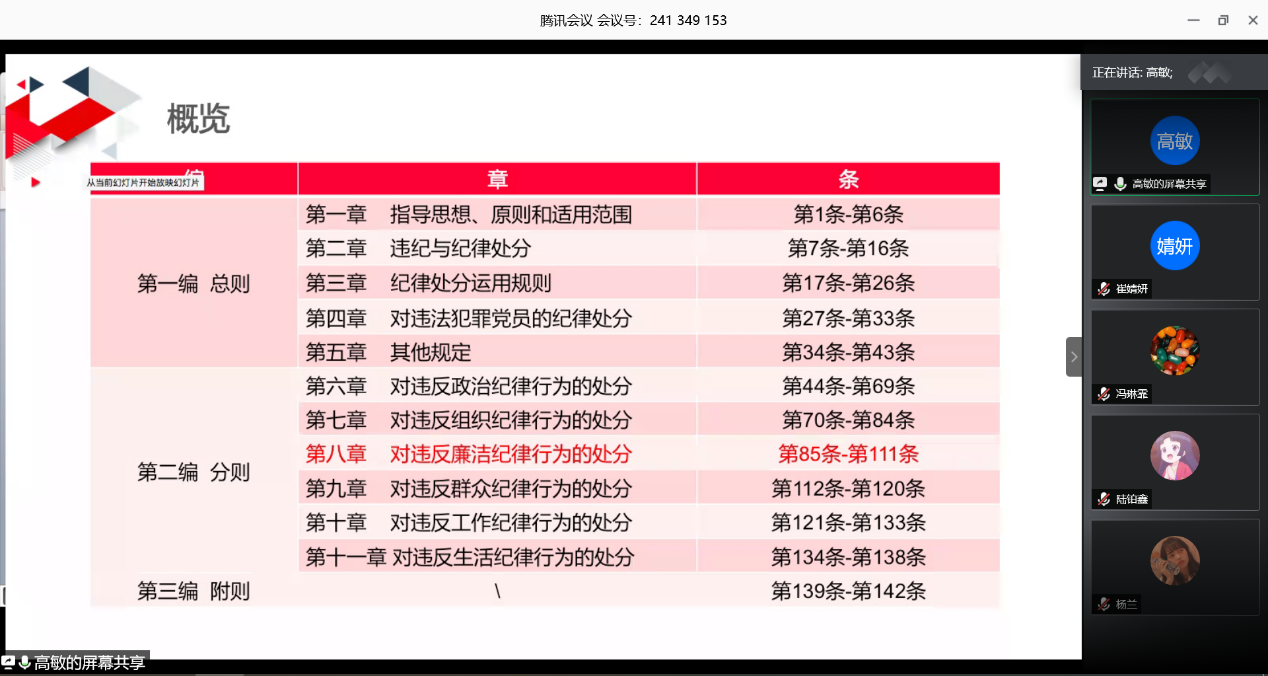 5月19日中午,suncitygroup太阳集团开展了第十三期发展对象培训班第5次线上党课。公司党委副书记高敏为公司发展对象讲述了“中国共产党纪律处分条例及廉洁自律准则”的专题党课。
