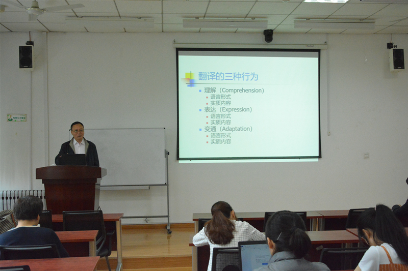张文涛介绍了李长栓的学术经历和研究方向并对其到来表示欢迎。随后,在报告中,李长栓讲到译者要利用宏观思维、逻辑思维、批判性思维和调查研究,发现作者意欲传递的主客观事实,并以适当方式再现这些事实,必要时对原文内容进行变通。他认为做好翻译需要达到以下三点:理解要接近、达到甚至超过原文作者的水平;表达作者清楚表达、希望表达、应该表达的意思;译文表达形式与原文相同、相近或完全不同。整场报告,他用具体的事例论证,生动形象,详细解说翻译是发现文字背后意图和事实真相的过程,让每个员工受益匪浅。