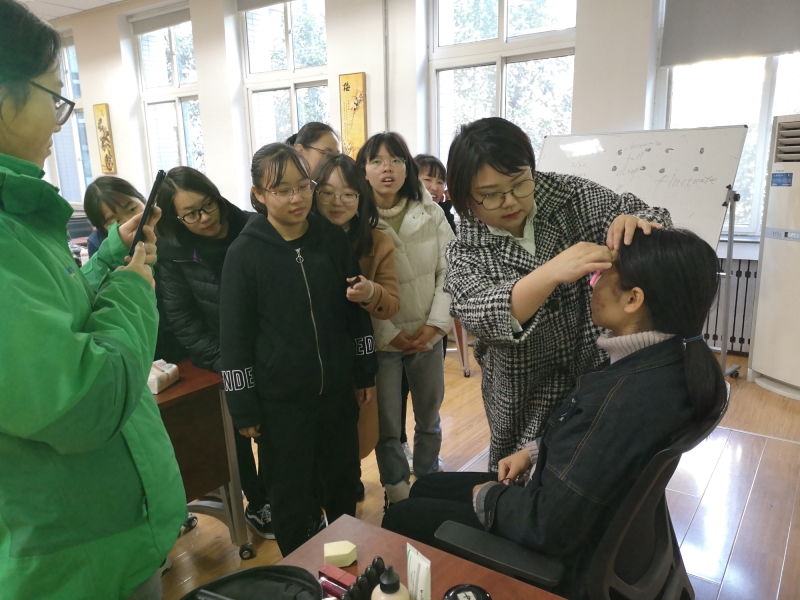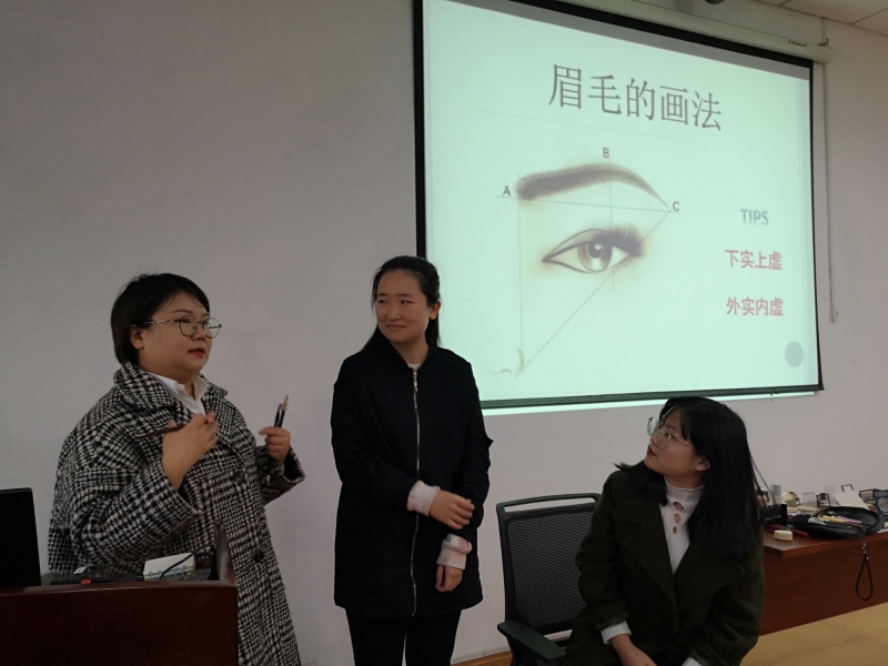 简短的自我介绍之后,李芸结合自己多年来的职业经验从“职业妆”和“生活妆”两方面为同学们详细介绍了规范的化妆步骤和技巧。从面试官的角度讲授了职场中受欢迎的妆容和穿搭。她强调,职场妆容要低调,避免个性化打扮,要在最不同的场合展现出适合自己的妆容。