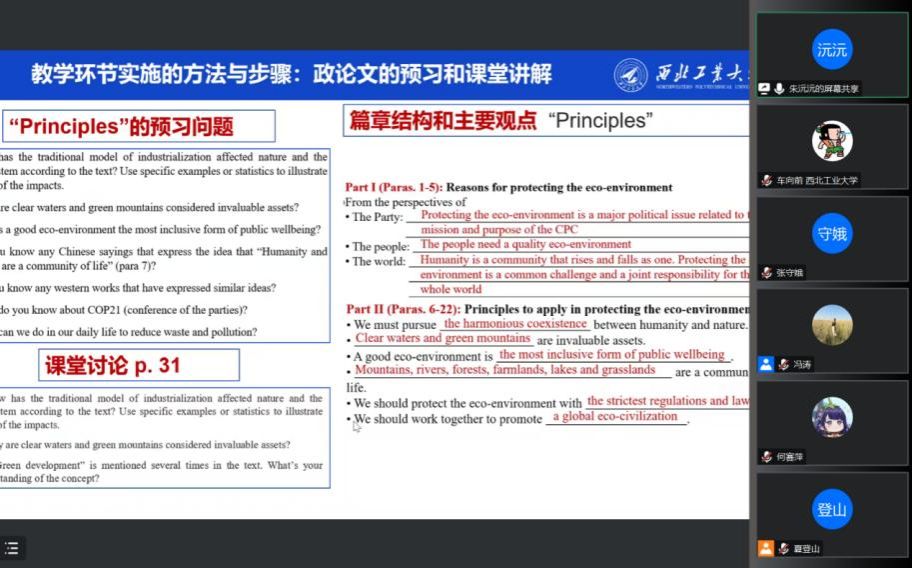 朱沅沅首先就“理解当代中国”教材在公司各个专业的使用情况做了简要介绍,接着以《英语读写教程》第二单元为例,展示了与原教材在英语专业“阅读与思辨”课程中的融合情况。朱沅沅详细阐述了教学环节设计的依据、选择补充读物与设计小组活动的思路、教学环节实施的方法与步骤等,突出了政论文统领、反思性学习等教学特点。