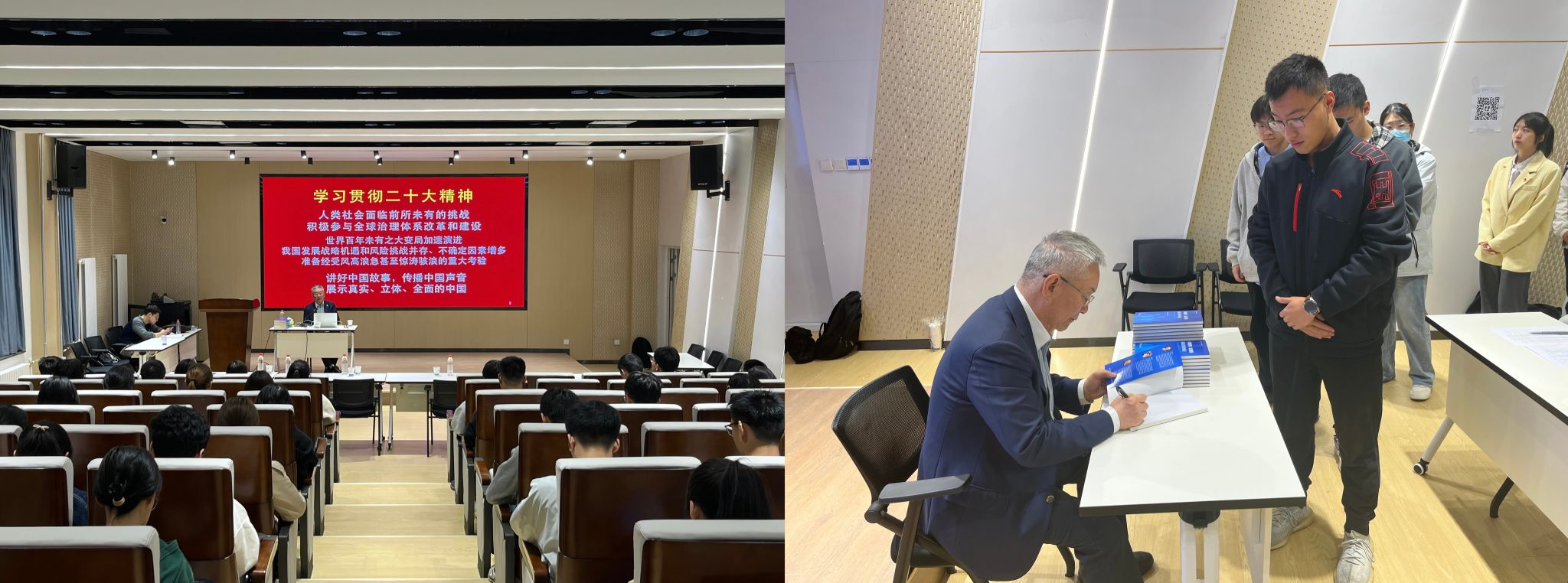 讲座伊时,宋允孚为到场的同学们进行了签名赠书活动。宋允孚、张幼云和陈恳老师合著的《全球治理 家国情怀——国际公务员的成长》一书以时代、国家和个人发展为线索,用三位曾在世界卫生组织、国际劳工组织等国际组织工作数年的资深国际公务员的真实经历,激励青年树立远大理想、培养家国情怀、国际视野,锲而不舍、驰而不息地进行努力、追逐梦想。赠书现场,同学们和宋先生近距离接触,反响热烈。