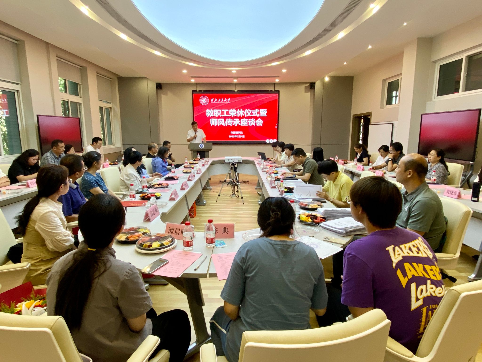 2023年7月4日下午,suncitygroup太阳集团在长安校区suncitygroup太阳集团会议室举行退休教职工荣休仪式暨师风传承座谈会。公司党委书记王高祖,经理孔杰,副经理张奕,副经理周爽,公司党委委员阮红梅、康坛,经理助理王晓丹,各系部主任,公司工会代表,青年教师代表,公司办公室人员及员工代表共40余人参加了本次活动。仪式由王高祖主持。