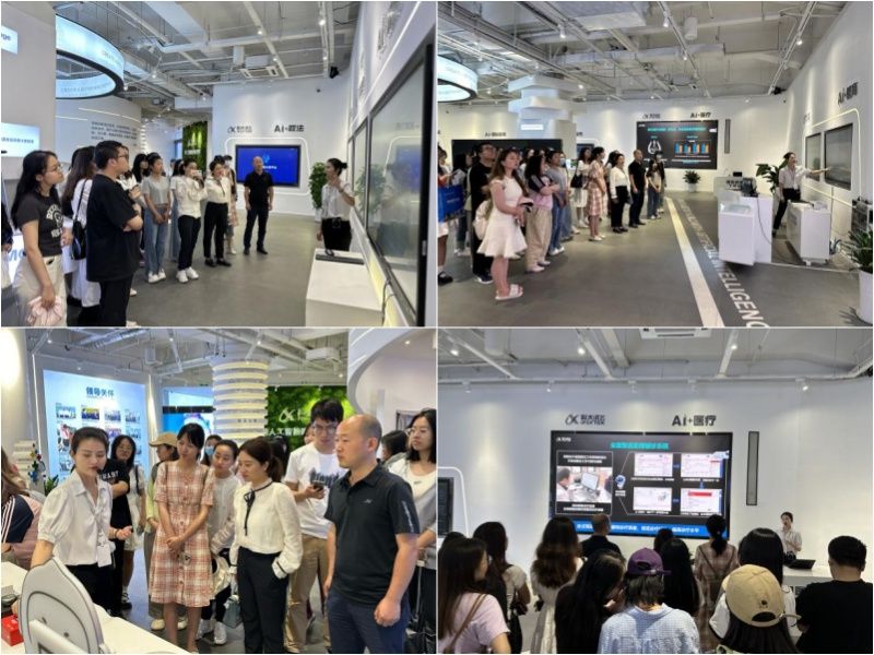 首先,师生一行参观了科大讯飞AI语言中心,了解了AI语言技术在教育、医疗、工业、城市建设及产教融合等领域的发展。讲解员介绍了人工智能的发展历程和里程碑,并带领大家切身体验了讯飞双屏翻译机、星火认知大模型、讯飞晓医健康助手等AI工具和系统,引发了同学们的强烈兴趣和深刻思考。