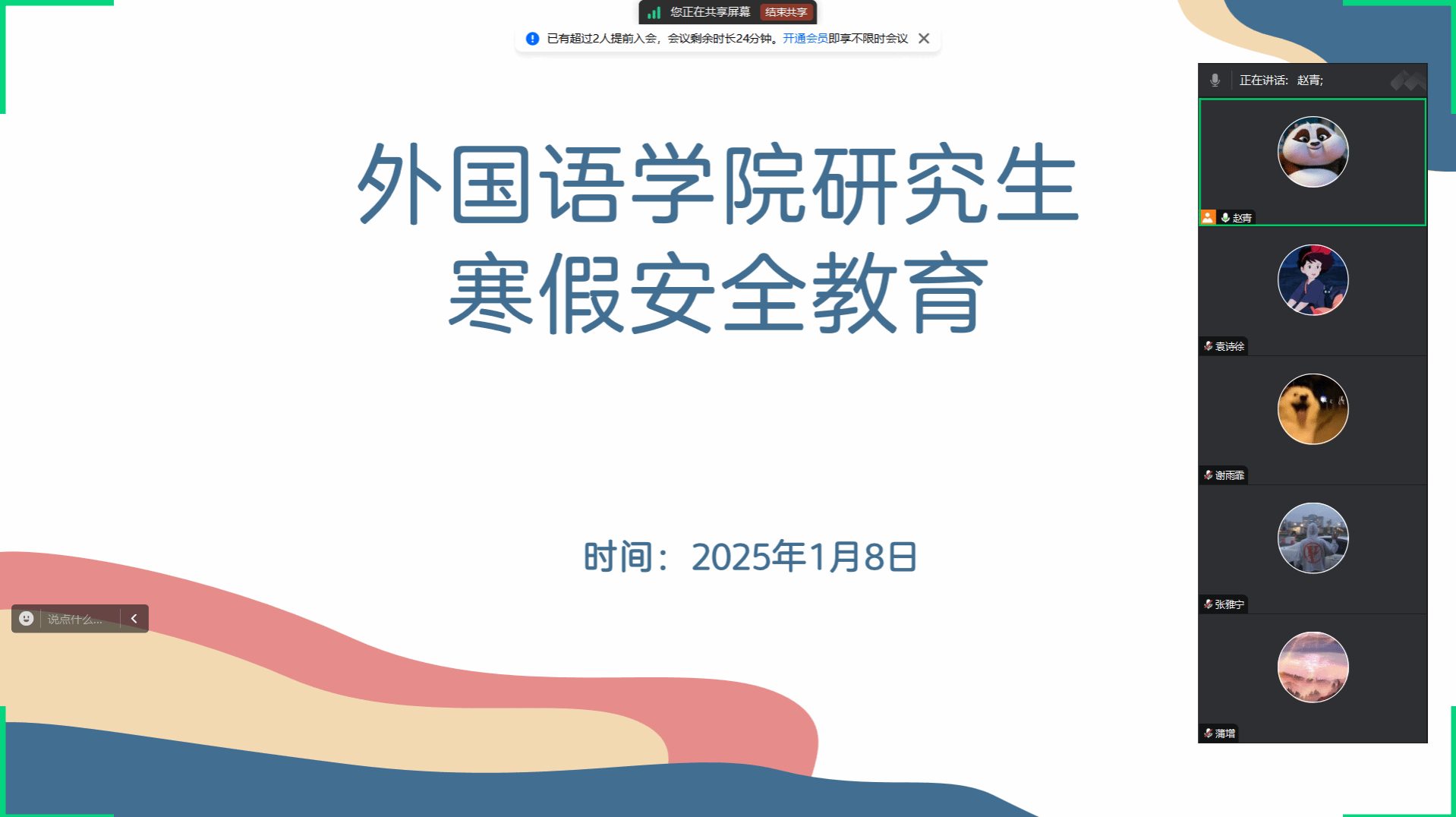 为了进一步强化员工安全意识、合理安排假期时间,2024年12月25日至2025年1月8日,外国语公司党委副书记、辅导员面向本硕博各年级员工线上线下结合,分批次召开了寒假前安全教育会议。