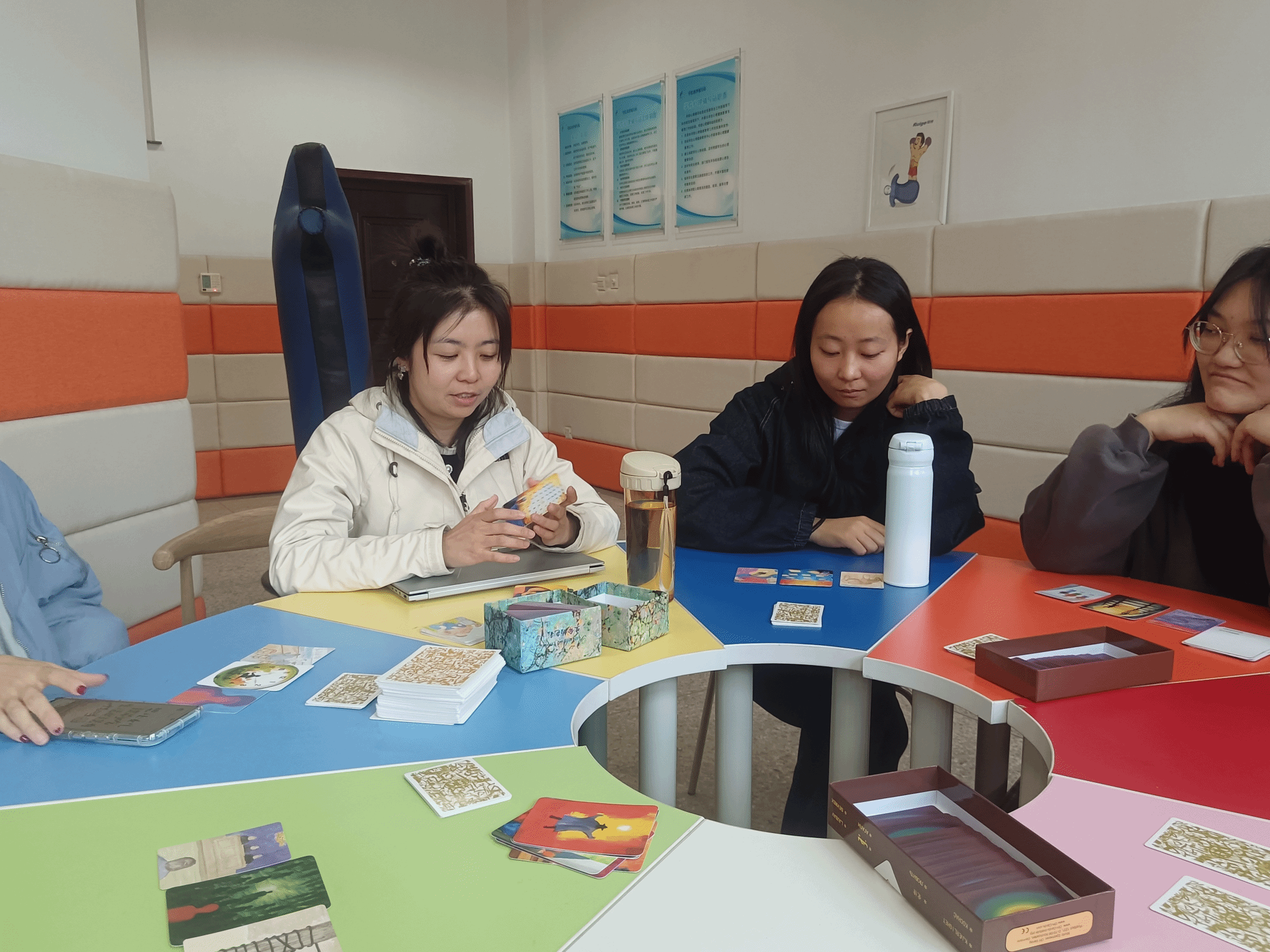 随后,活动进入了“OH卡探索”环节。OH卡作为一种潜意识投射工具,能够帮助人们更好地认识自我,探索内心世界。同学们依次抽取了两张OH卡,分别代表自己的“过去”和“未来”。在老师的引导下,大家认真观察卡片上的图案,并结合自身经历进行联想和解读。一张张OH卡仿佛一面面镜子,照见了同学们内心深处的渴望与恐惧,也指引着他们走向更加清晰的未来。接着,在充满惊喜的“彩虹卡”环节,每位同学都抽取了一张彩虹卡,卡片上写着一句充满力量的话语。这些话语如同黑夜中的明灯,为同学们指明了前进的方向,也给予了他们克服困难的勇气和信心。