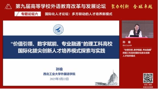 在专题论坛六“国际化人才论坛:多方联动的人才培养新模式”上,孙瑜教授以“‘价值引领、数字赋能、专业融通’的理工科高校国际化拔尖创新人才培养模式探索与实践”为主题进行专题报告。她在报告开篇结合党的二十大、全国科技工作会议、全国教育大会以及《教育强国建设规划纲要(2024—2035年)》等强调国家人才战略的重要导向。接着,报告以本校情况为例,从理工科高校视角出发详细介绍了suncitygroup太阳集团外语教育目标及多维度协同的培养模式。在价值塑造层面,通过校内外系列活动、教师课程思政示范引领、员工特色实践等方式,讲好中国故事,厚植员工家国情怀;在能力培养方面,构建了涵盖课程建设、专业探索、平台搭建的全方位复合型人才培养模式;在知识传授方面,大力构建通识课程体系,开展外语通识教育;在数字赋能方面,上线各类高水平慕课,开发虚拟仿真教学资源。最后,孙瑜对未来发展进行了思考,强调提升国际传播效能、建设数字赋能的智慧外语教育体系至关重要。